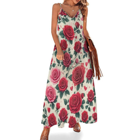 Sleeveless Boho Ankle Length Sling Maxi Dress Featuring Gorgeous Red Roses Print - Summer Outfit Essential