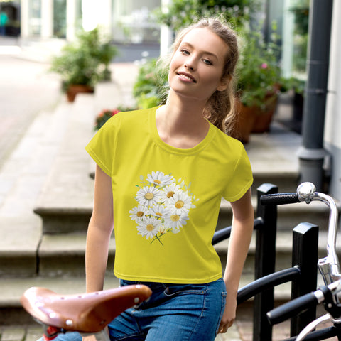 Add a pop of sunshine to your wardrobe with this charming yellow crop tee featuring a delightful bouquet of daisies on the front. Perfect for sunny days and flower lovers alike, this top is sure to brighten up your outfit with its playful and feminine design. Made from soft and comfortable fabric, it is ideal for casual outings or relaxing at home. Bring a touch of floral freshness to your style with this beautiful daisy tee!