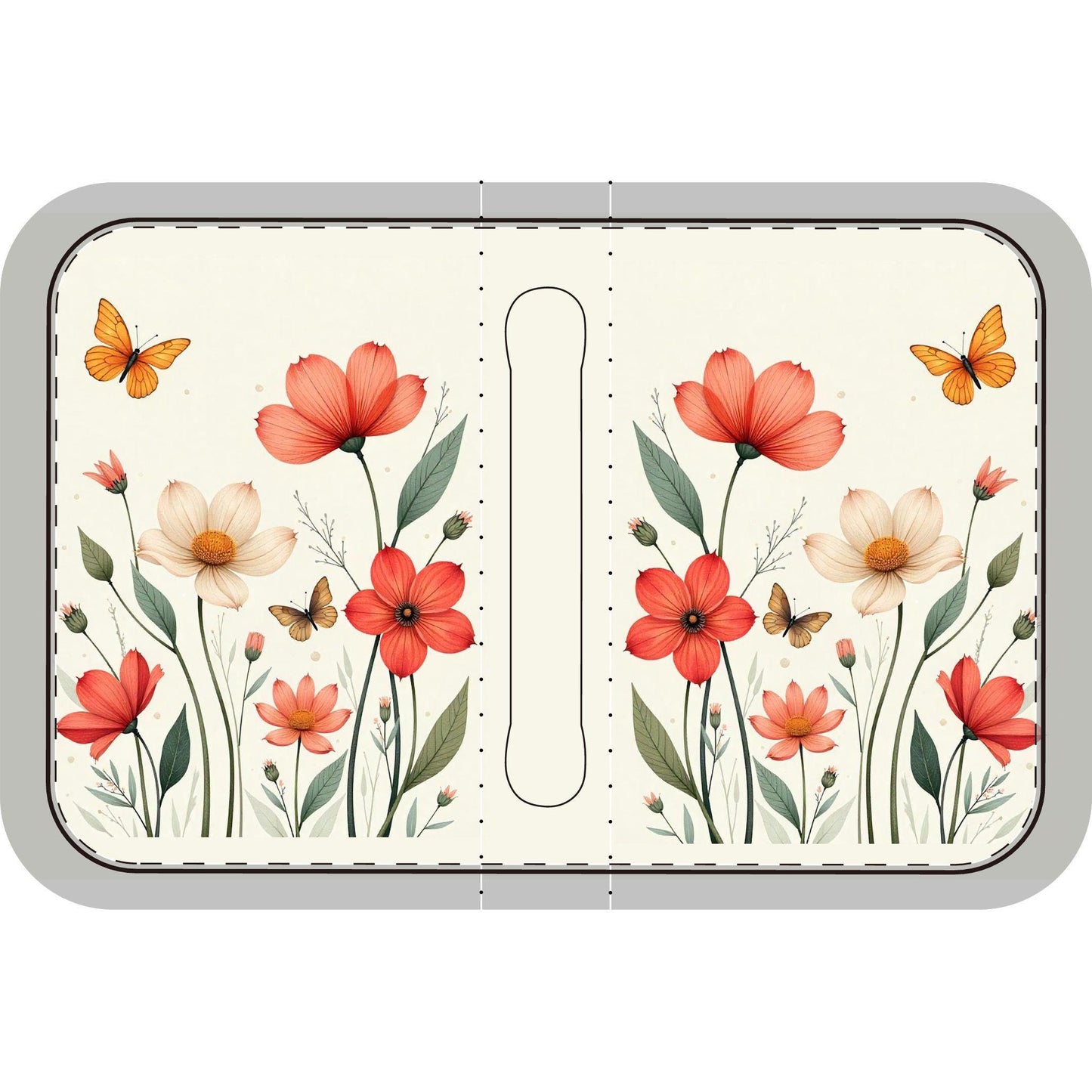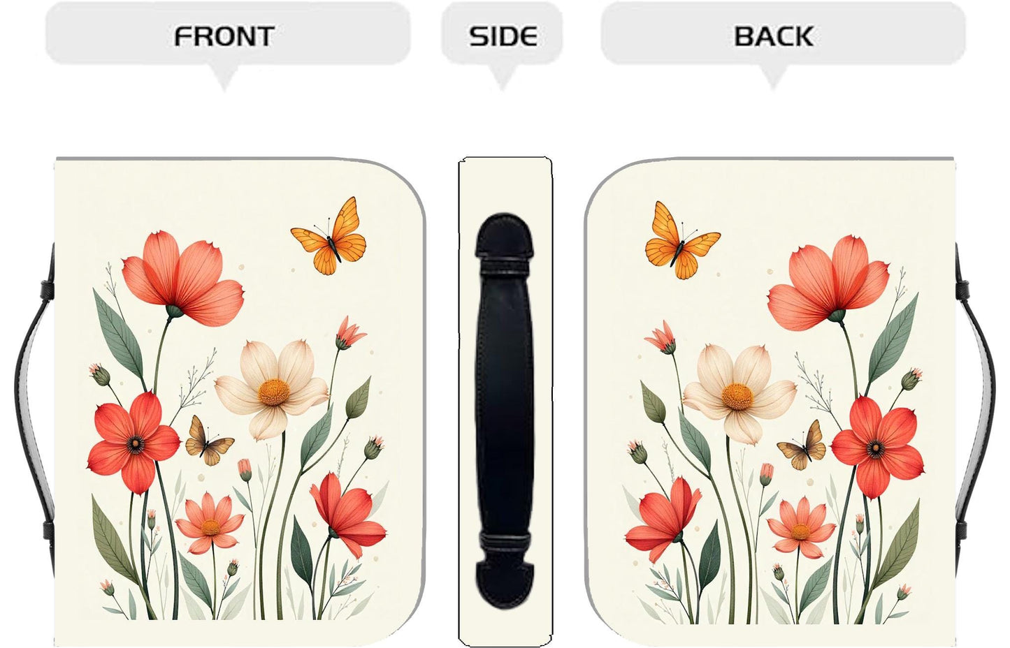 A Bible cover featuring orange spring flowers and a butterfly on a plain off-white background, providing a minimalist and serene vibe. Perfect for those looking to protect and personalize their Bible. Ideal for religious holidays, gift-giving occasions, and everyday use.