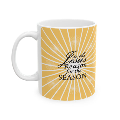 A festive ceramic mug featuring a Christmas quote 'Jesus is the Reason for the Season' with light bursting behind it. Perfect for adding a touch of holiday spirit to your morning coffee or tea routine. Ideal for those who celebrate Christmas and want to embrace the true meaning of the season.