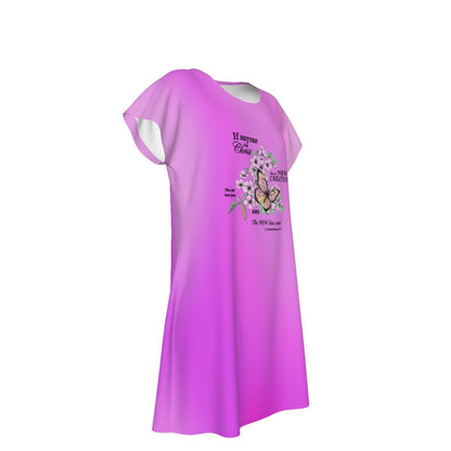 Transform your sleepwear collection with our Cute Oversized T-shirt featuring the uplifting message of 2 Corinthians 5:17: "Therefore, if anyone is in Christ, he is a new creation." This New Creation Bible Verse Graphic beautifully captures the essence of renewal and hope, making it the perfect addition to your cozy nights. Crafted as a Women's Short Sleeve Nightshirt, this stylish sleep dress drapes elegantly over your figure, ensuring a comfortable fit for any night in or casual outing. The adorable pink gradient adds a touch of calming beauty, making this t-shirt not just a sleep essential but also a fashionable statement. Embrace comfort and faith with this versatile piece – perfect for lounging, sleeping, or enjoying a lazy day at home! The dress can be suitable for ladies of all body shapes; Nice fabric can provide with all-day ease