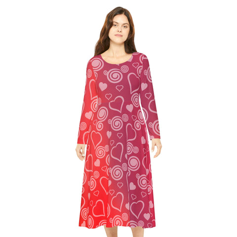 Dance Dress, Red Hearts and Swirls Valentine's Day Women's Long Sleeve Dress, Romantic Celebration Outfit, Love Dress, Holiday Maxi Dress
