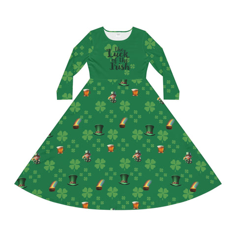 Dance Dress, St Patrick's Day Irish Lucky Charm Women's Long Sleeve, 4 Leaf Clover, Pot o' Gold, Leprechaun, Irish Beer Mug, Green Top Hat,