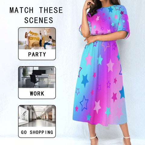 Dreamy Pink Blue Purple Gradient Starry Ankle Length Dress - Comfortable Elastic Waist Fashion