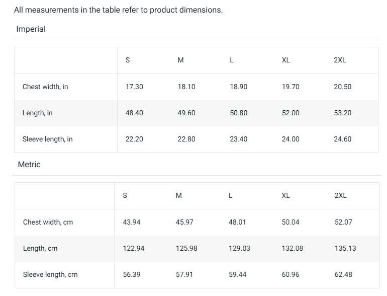Chest width, in S...17.30 M...18.10 L...18.90 XL...19.70 2XL...20.50