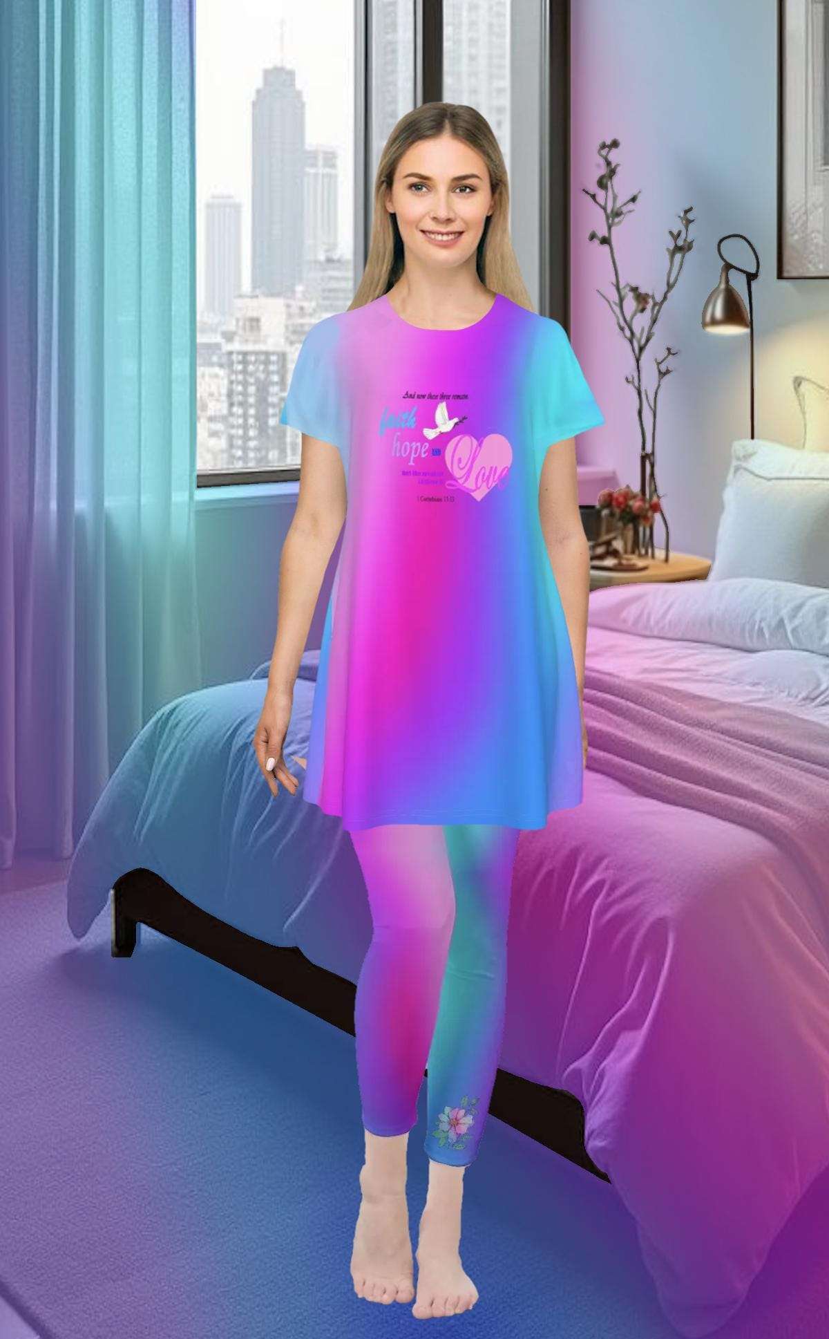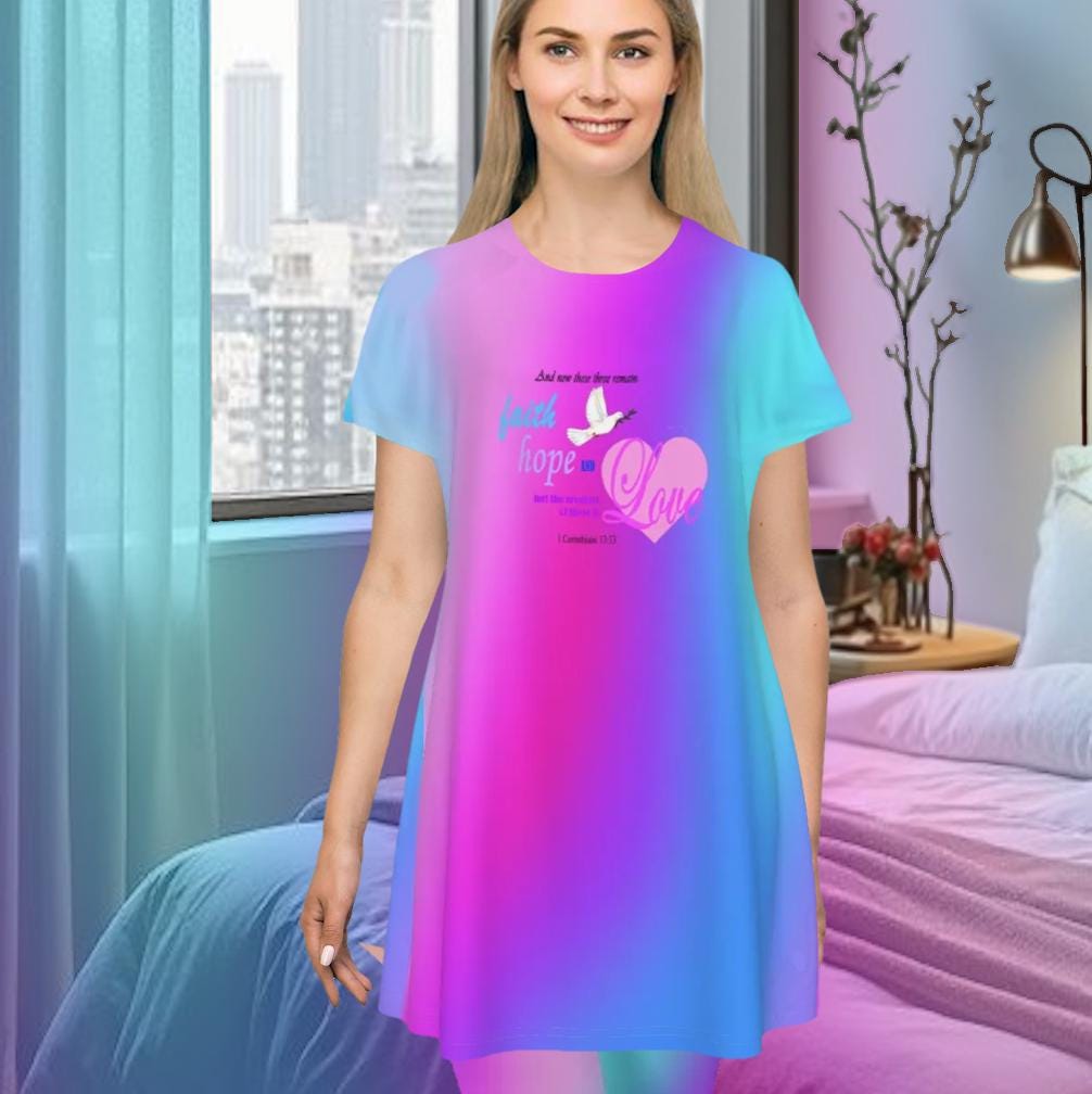 Faith Hope Love Oversized T-Shirt | Pink Blue Purple Gradient Tee, Inspirational Bible Verse, Women's Short Sleeve Nightshirt, Sleep Dress