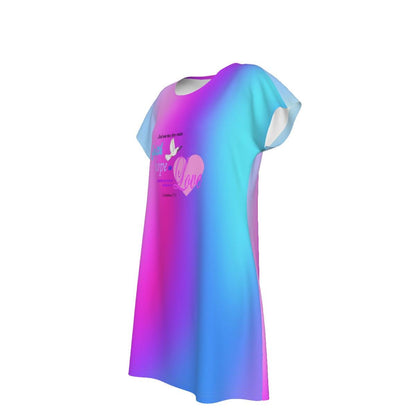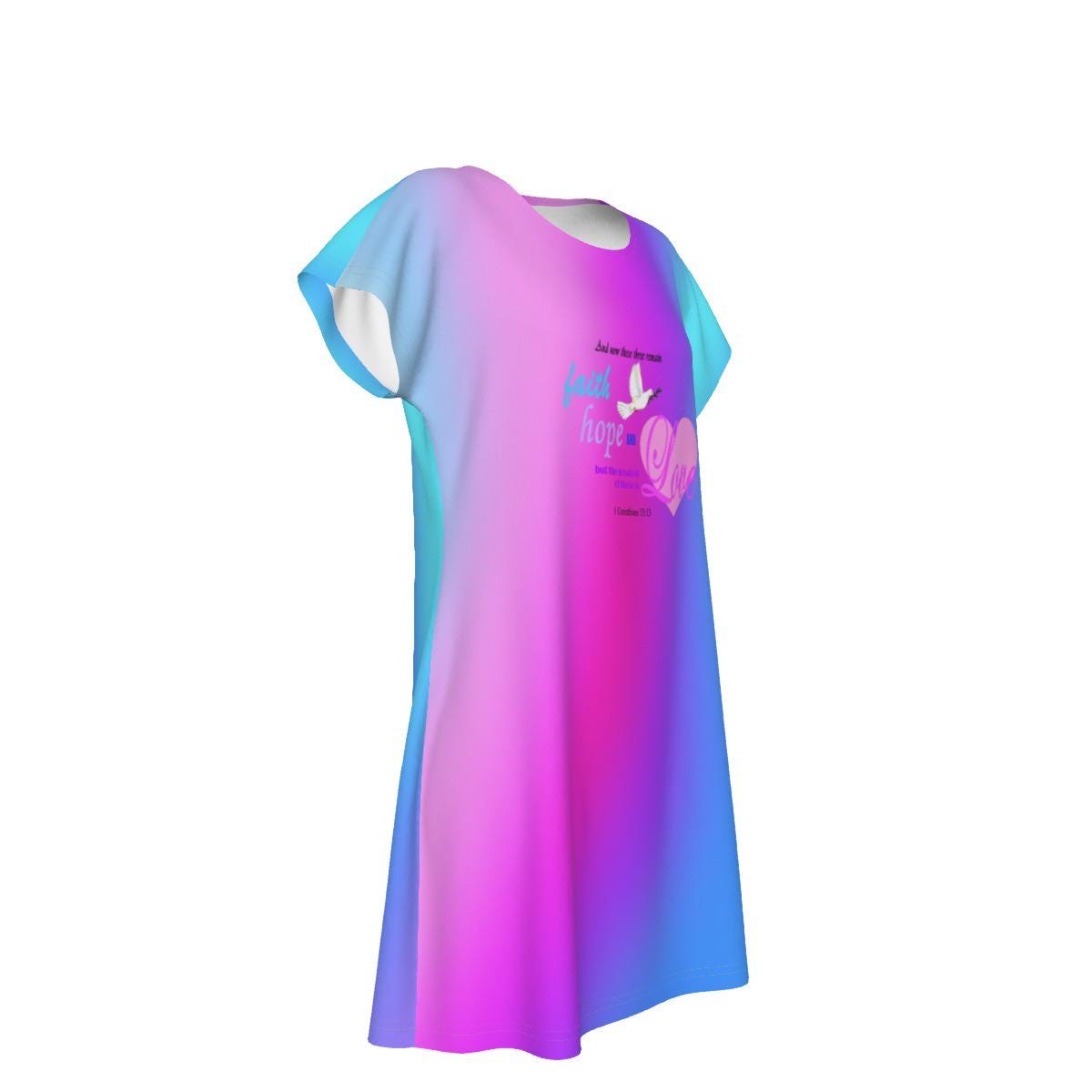 Embrace comfort and style with our Blue Gradient Oversized T-shirt Dress, adorned with a charming 1st Corinthians 13:13 Bible Verse graphic that beautifully highlights the themes of Faith, Hope, and Love. This dress is perfect for casual outings or relaxing at home, featuring a soft, breathable fabric that drapes effortlessly. The stunning pink, blue, and purple gradient adds a touch of uniqueness, making it a standout piece in your wardrobe. Whether you’re dressing it up with some trendy accessories or keeping it casual with your favorite sneakers, this versatile dress is a wonderful reminder of the values that inspire us daily. Perfect for any occasion, it also makes a thoughtful gift for loved ones! The dress can be suitable for ladies of all body shapes; Nice fabric can provide with all-day ease and comfort
