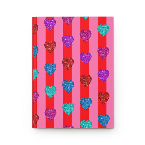 A colorful hearts design on a striped pink and red background adorns this hardcover journal, giving off a cheerful and vibrant vibe. Perfect for jotting down thoughts, doodles, or daily plans. Ideal for those who love to journal and stay organized. Great for Valentine's Day, birthdays, or just because gifting.