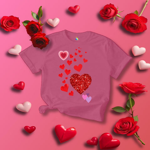 A T-Shirt featuring different sized hearts, giving off a cute and romantic vibe. Perfect for everyday wear or as a casual statement piece. Ideal for those who love expressing themselves through their clothing. Great for Valentine's Day, anniversaries, and casual events.