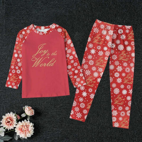 Kid's Red Christmas Holiday Sleepwear Set, Festive 'Joy to the World' Quote - Matching family pajama outfit, long sleeves loungewear, 2 pc