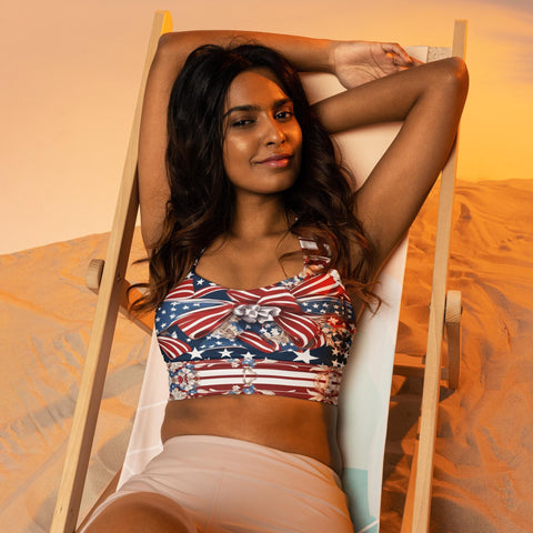 Patriotic USA Flag Inspired Recycled Longline Sports Bra, Independence Day Workout Top, Gym Yoga Bra, July 4th Unique Yoga Bra Athletic Wear