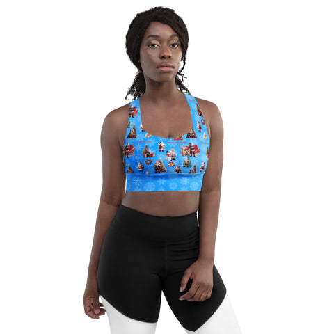 Santa Claus Longline Sports Bra: Recycled Snowflake Kawaii Art – Light Blue Snowflake Holiday Activewear Workout Top