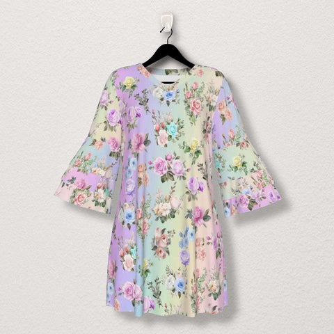 Stacked Ruffle Boho-Inspired Women's Sleeve Dress in Pastel Rainbow Floral Print | Perfect for Spring, Easter, or Mother's Day