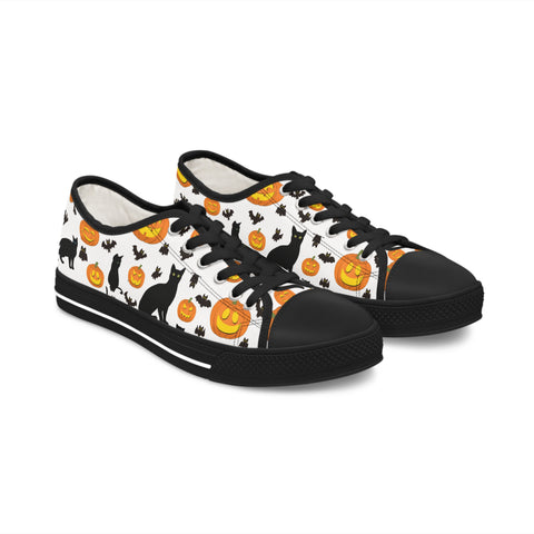 Womens Low Top Sneakers with Pumpkins Bats and Black Kitty Cat Pattern, Casual Halloween Lace Up Canvas Shoes for Fall Outfits